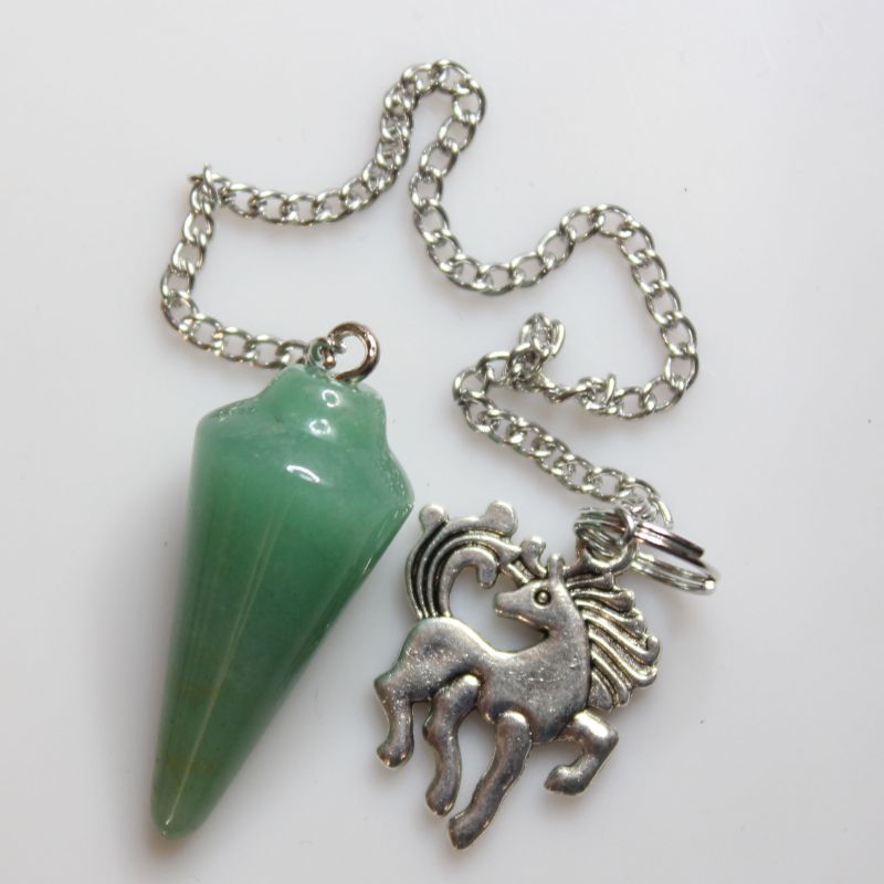 Kyvadlo aventurín v délce 3,5 cm s bižuterním řetízkem 15 cm a přívěskem motivu koně.