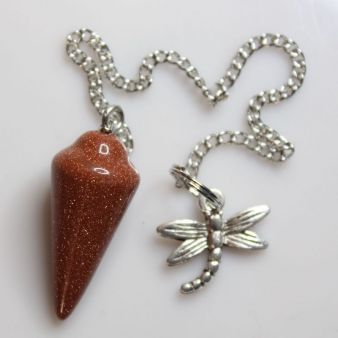 Kyvadlo sluneční kámen syntetický v délce 3,5 cm s bižuterním řetízkem 15 cm a přívěskem motivu vážky.