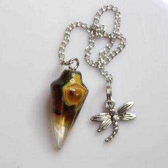 Kyvadlo kouřové v délce 3,5 cm s bižuterním řetízkem 15 cm a přívěskem motivu vážky.